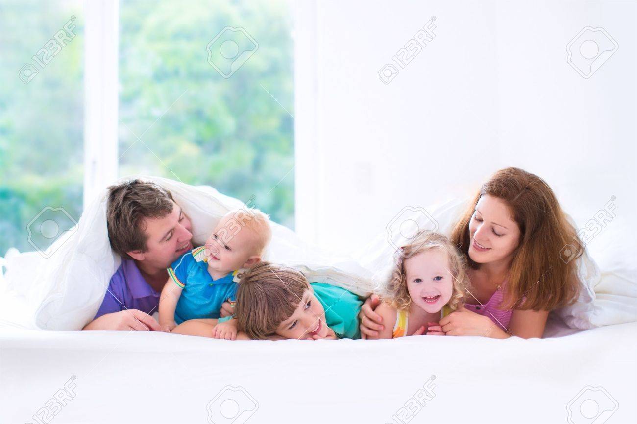 幸せな大家族 笑って男の子 かわいい幼児の女の子と愛らしい小さな赤ちゃん白い日当たりの良い Bedrom 自宅でベッドで遊んでカラフルなパジャマを着て 3 人の子供を持つ若い親 の写真素材 画像素材 Image